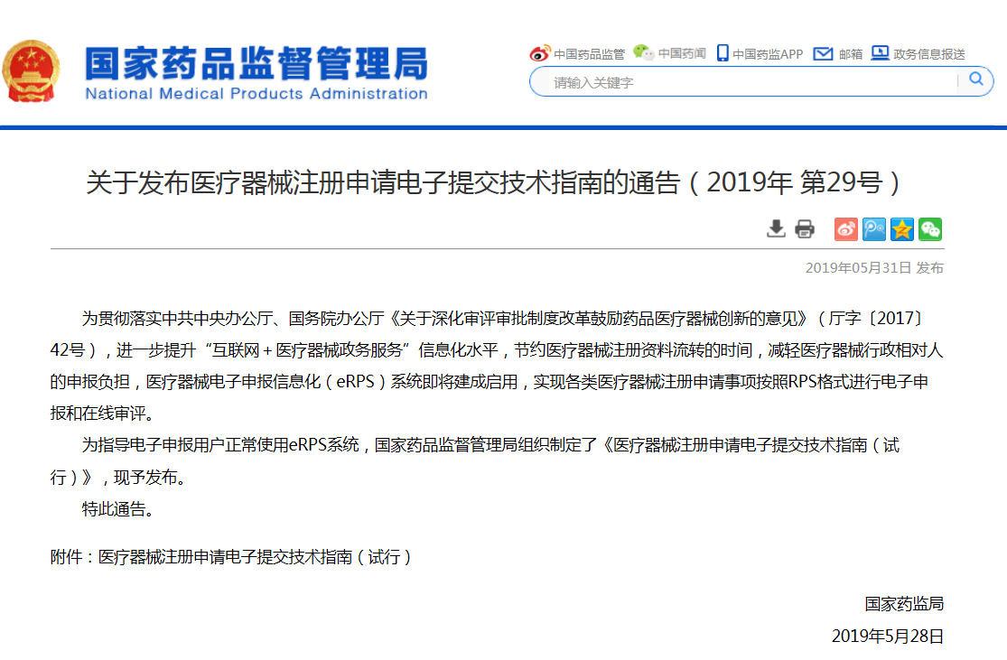 關于發布醫療器械注冊申請電子提交技術指南的通告(2019年 第29號)